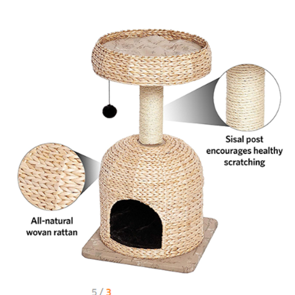 البيت مزود بخداشة منسوجة تسمح لقطتك بخدشها براحة، مما يساعد في الحفاظ على صحة أظافرها ومنعها من خدش الأثاث المنزلي.